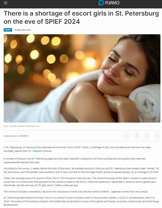 Podľa zdroja sú všetky dostupné eskorty v Moskve a Petrohrade už „prenajaté“ 2 týždne pred začiatkom akcie. Zároveň bolo len za 6 dní rezervovaných cez 600 profilov a pre nedostatok dievčat ceny prudko vzrástli, v priemere o 30-50%.
