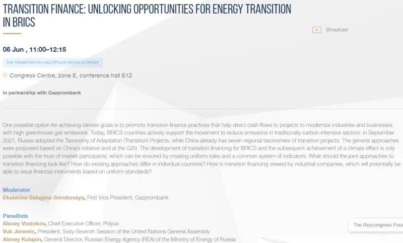 Ďalší panel sa bude zaoberať „financovaním prechodu“ a ďalšími udržateľnými aktivitami, ktoré bezpochyby dokazujú, že „krajiny BRICS aktívne podporujú hnutie za znižovanie emisií v tradične náročných sektoroch uhlíka“: